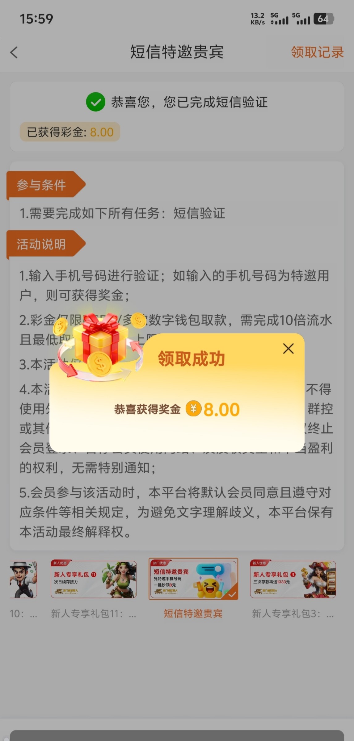 早上客服打电话喊我手机号特邀彩金,手机号特邀威尼斯人www.03.com,特邀领取8块,最低100最高200
