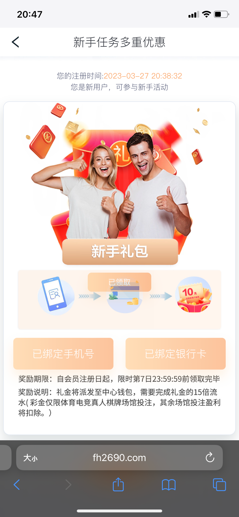 https://www.fh2690.com:30700/entry/register?r_code=7337491自己去优惠新人里面绑卡领