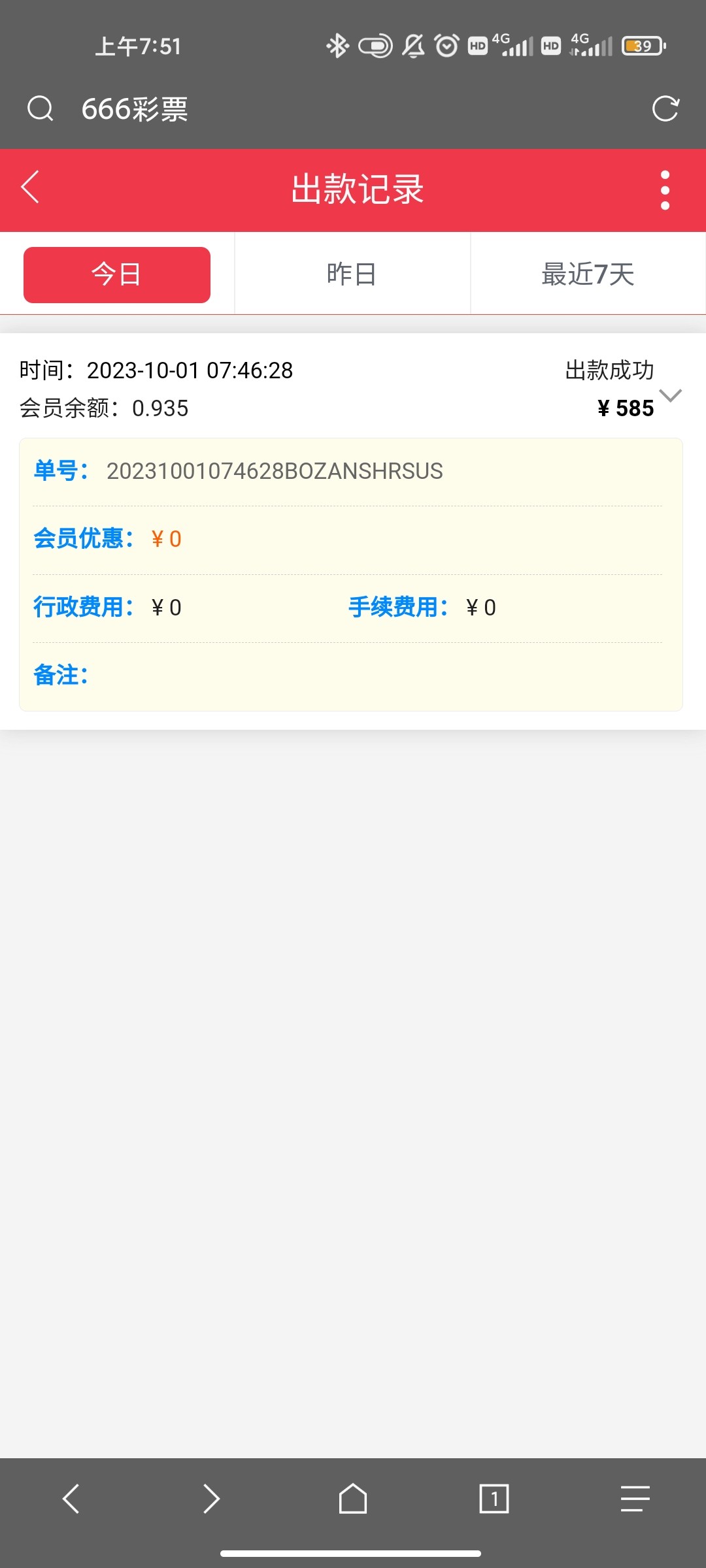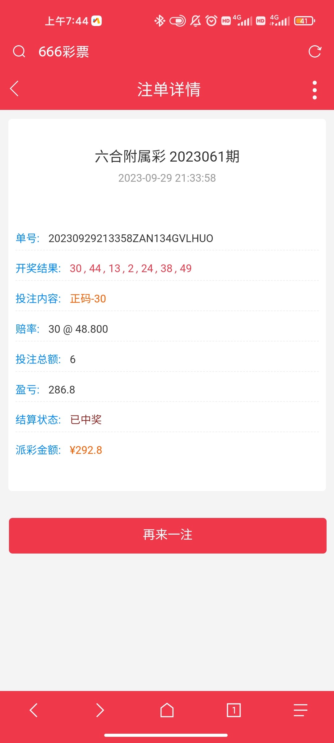 送了36,一个6块买了6个号码,中了两个,提现585秒到