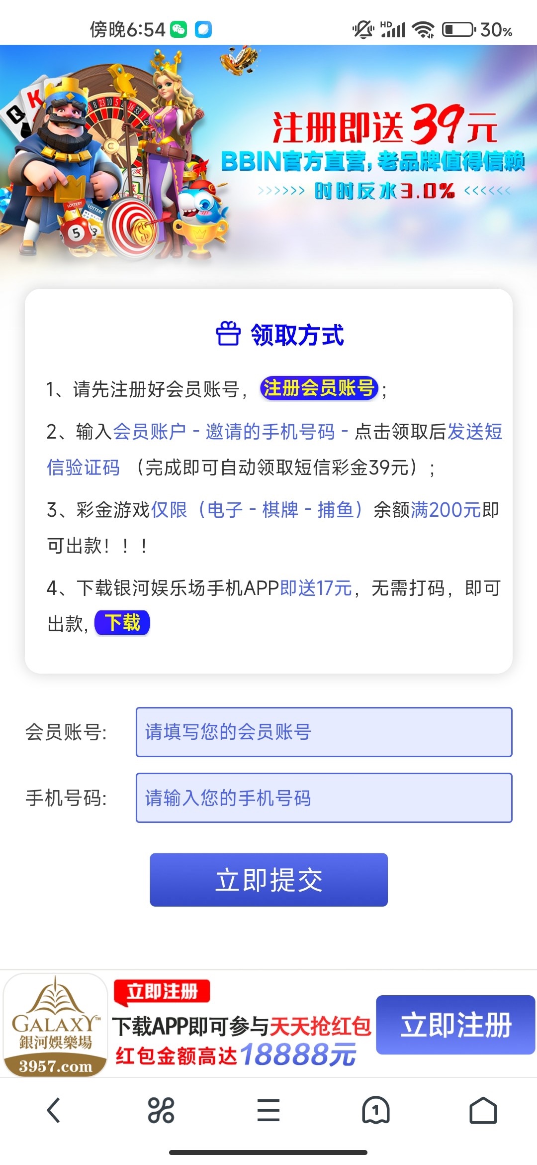 新用户注册绑卡手机号碰瓷送39彩金,还有下载APP送17活动 具体自测。