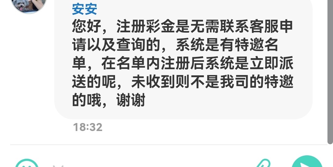 注册彩金是无需联系客服申请以及查询的,系统是有特邀名单,在名单内注册后系统是立即派送的呢,未收到则不是我司的特邀