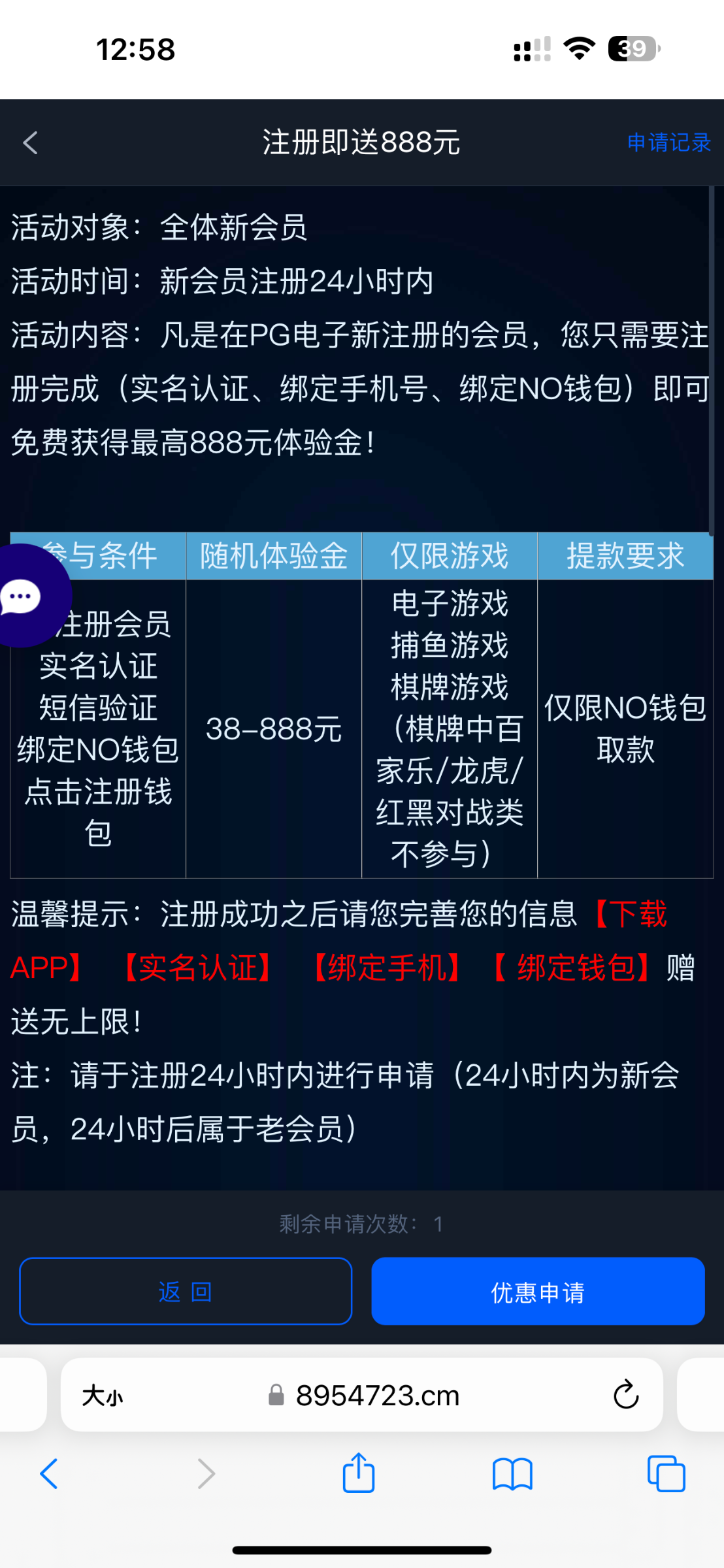 绑定的东西比较多看好再去申请彩金切记勿充值。