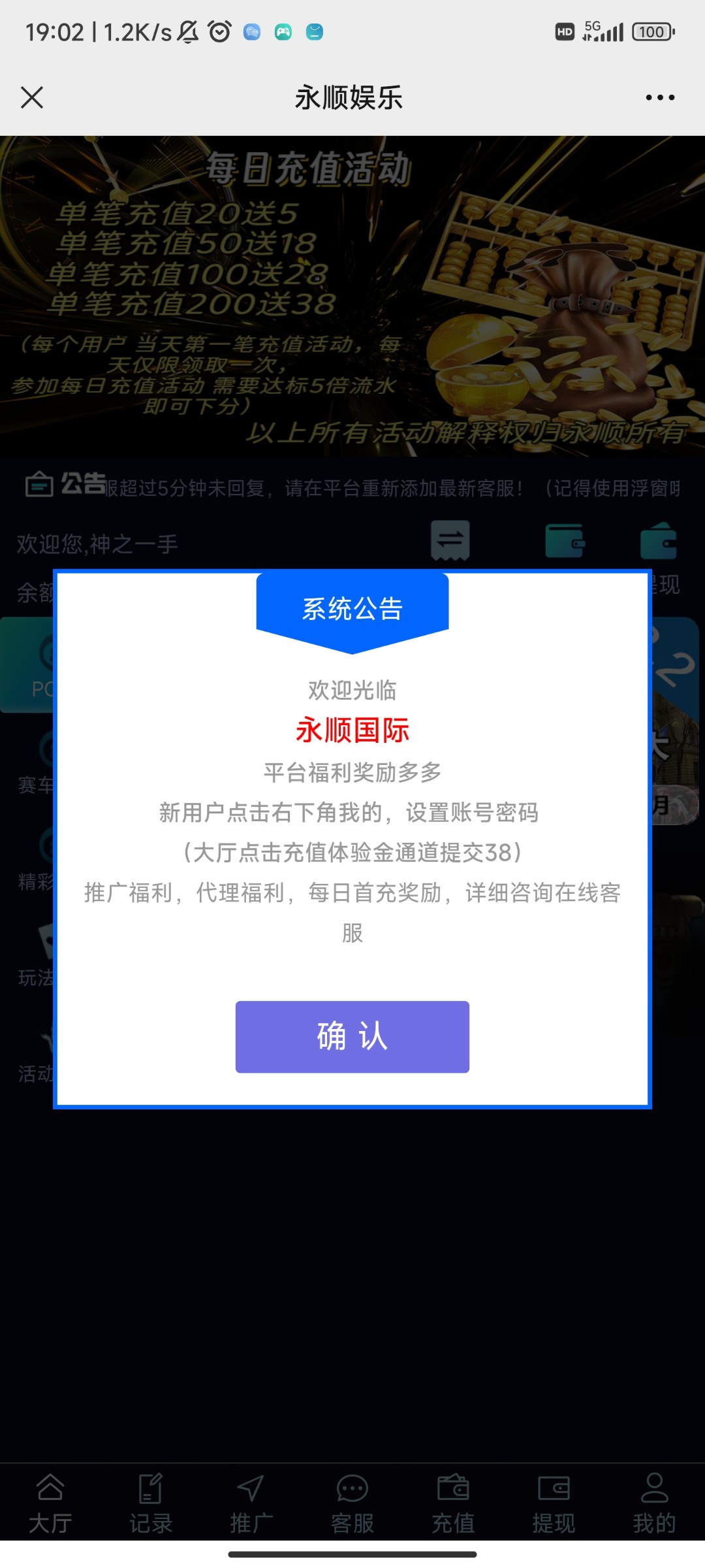领取方式充值通道里面有个体验金通道,秒领38打388下38