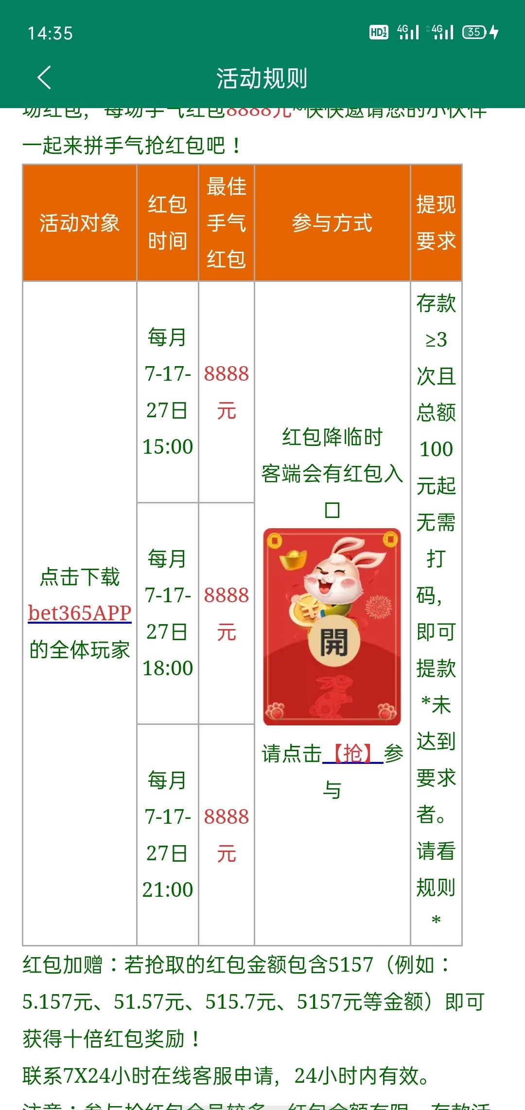 每个礼拜星期六都能抢3波红包,没充值也能抢5157和皇冠227一天3次能抢20左右,100就能提。我皇冠3个号,绑的都是自己的卡都能体现没封号,这种台子只要充100块抢的红包都不用打码可以直接提。当然我不是推荐你们充值啊.网站是直接数字后面加.com,今天星期六可以抢红包,不管充没充过