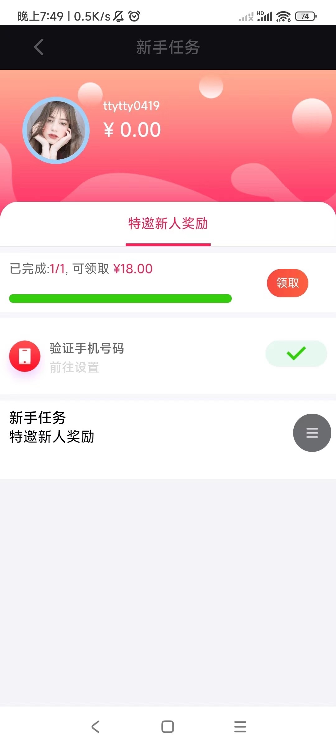 新老用户注册登入绑定手机号任务里领取秒18,应该是特邀碰瓷,可以看一下。
