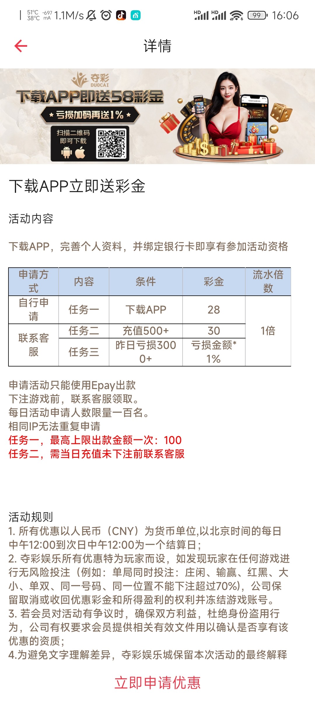 新用户下载APP注册绑定信息yhk等自助申请28 申请不了去联系客服去申请28彩金一倍流水满100提现