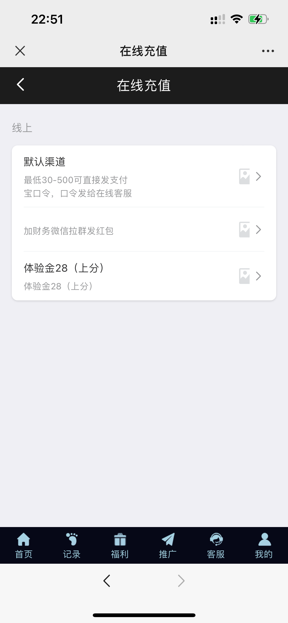 微信扫码去充值选项选择体验金充值 秒到28 打到288下28