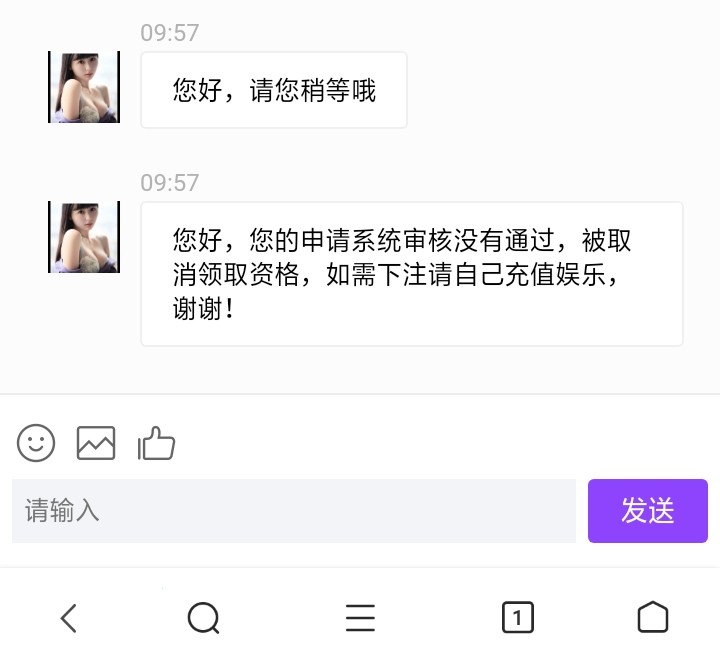 您好,您的申请系统审核没有通过,被取消领取资格,如需下注请自己充值娱乐,谢谢!