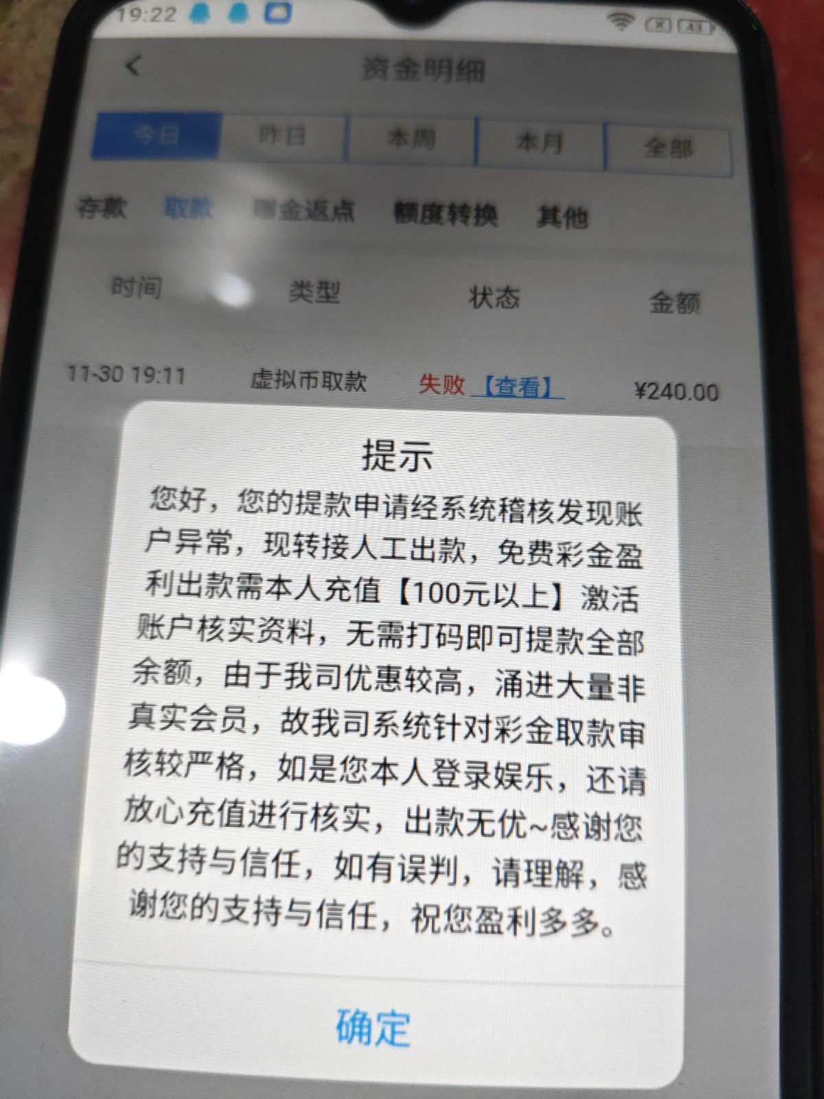 出不到假得很,送我288打了出款要喊存款128,结果第二天登录进去又送一个218神秘彩金显示完成一杯流水就可以出款,结果出款又是那样显示要存款128激活账户,撒子才会去存款