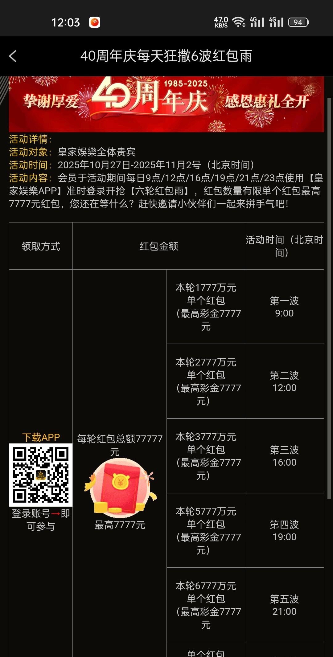 皇家娱乐周年庆抢红包,我抢了27,历史充值回馈,历史回馈我充值过但是还没收到,估计还没派发到我,有账号的老哥可以上号抢红包,充值过的也可以上号看看历史充值回馈到账了没
