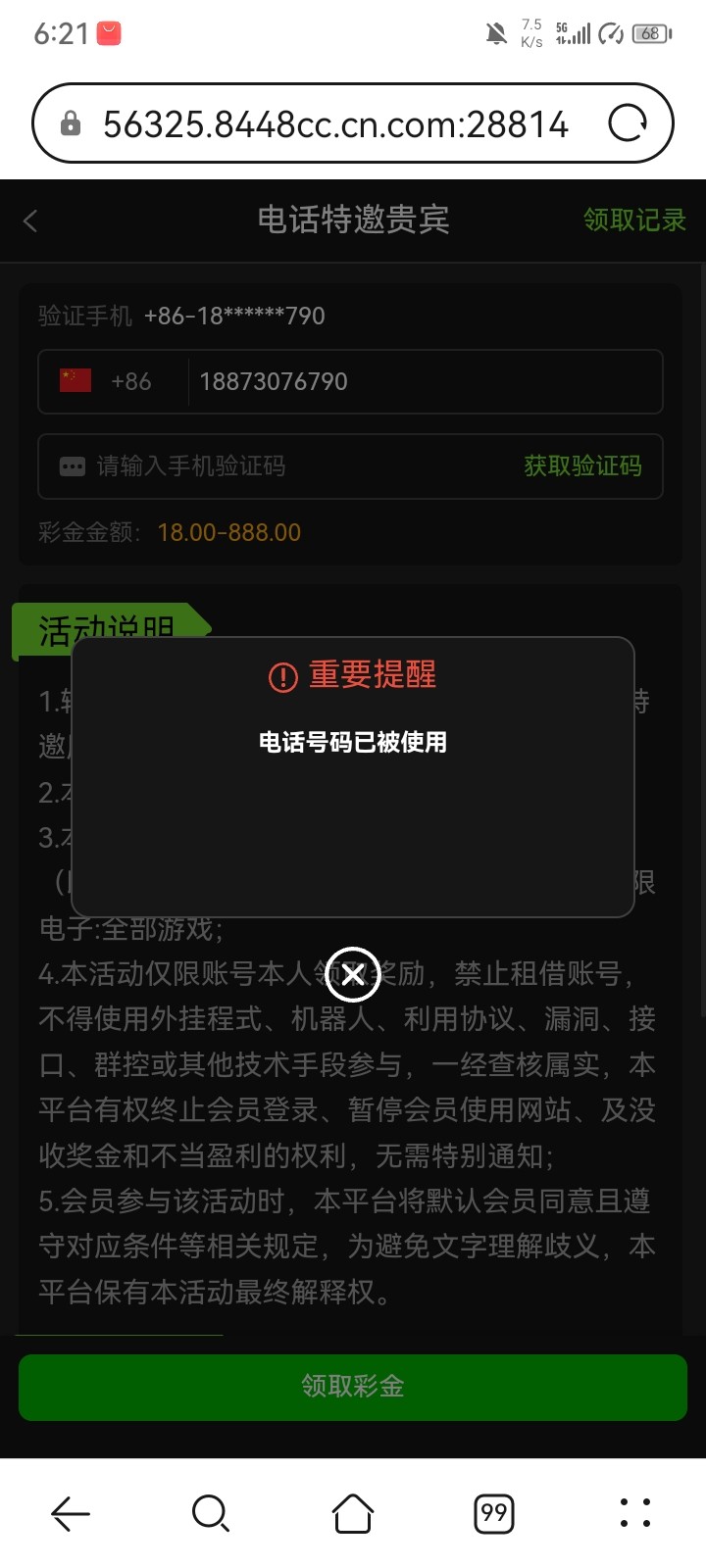 我之前注册领取过,今天打电话登录上去还可以领取,