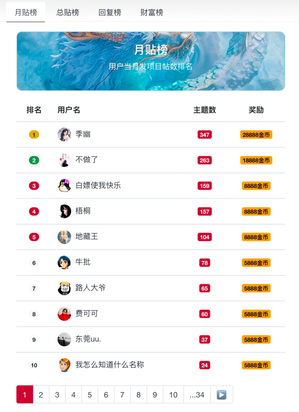 对当月发帖和活跃用户进行嘉奖