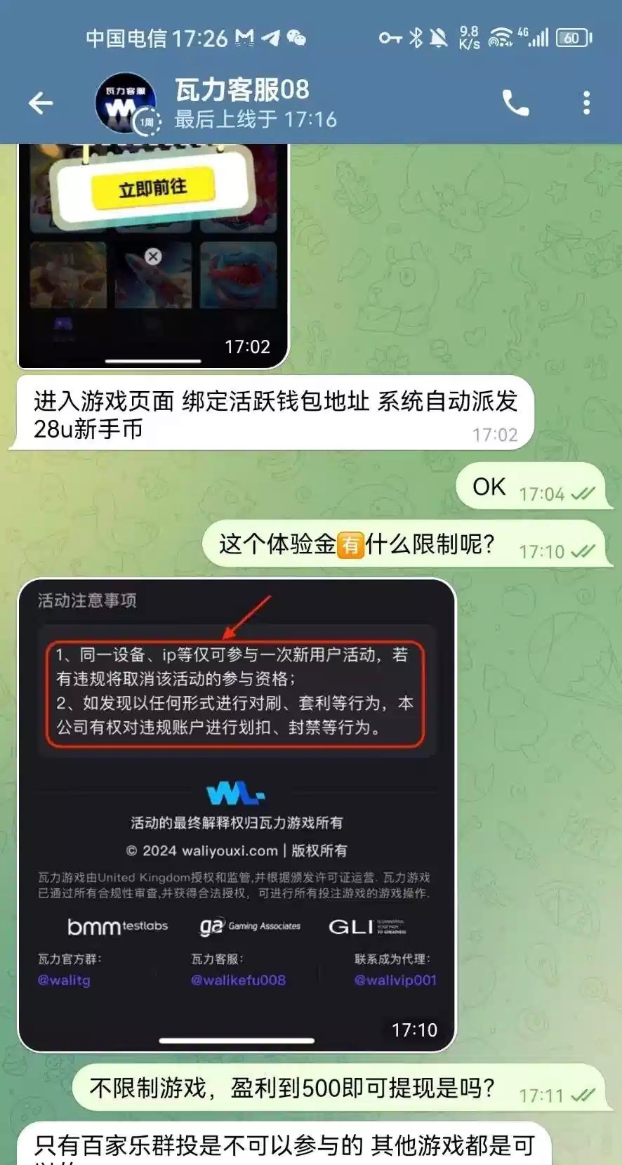 直接机器人进去,点新用户活动,绑定最近三个月活跃的地址和手机号自动领取,不限制游戏和流水,满500U提现(除了百家乐)