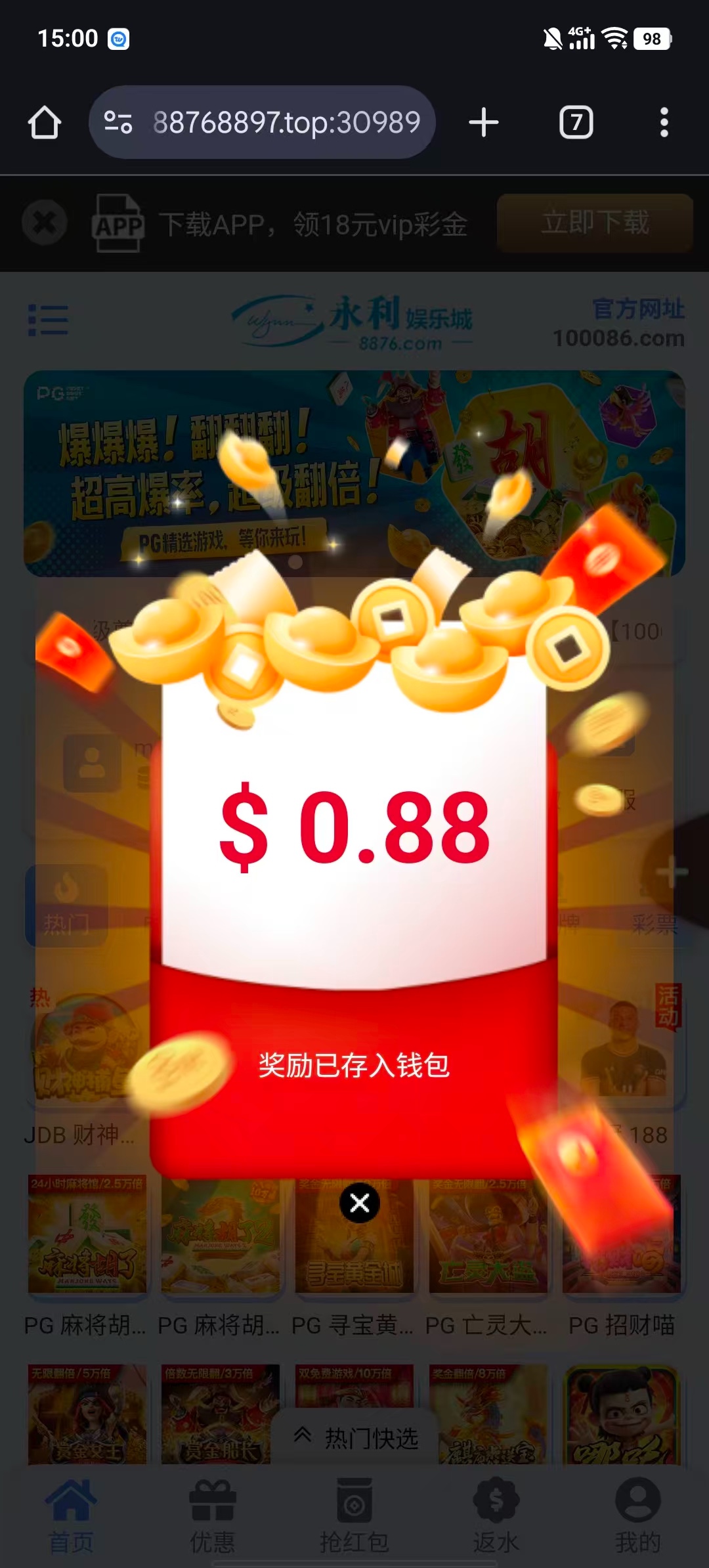 这个平台是最垃圾平台充值10次输10次,100块钱都很难赢,红包每次几毛钱,抢10倍红包的全是0.88,连1.88都没有一个,这个平台不建议充值玩