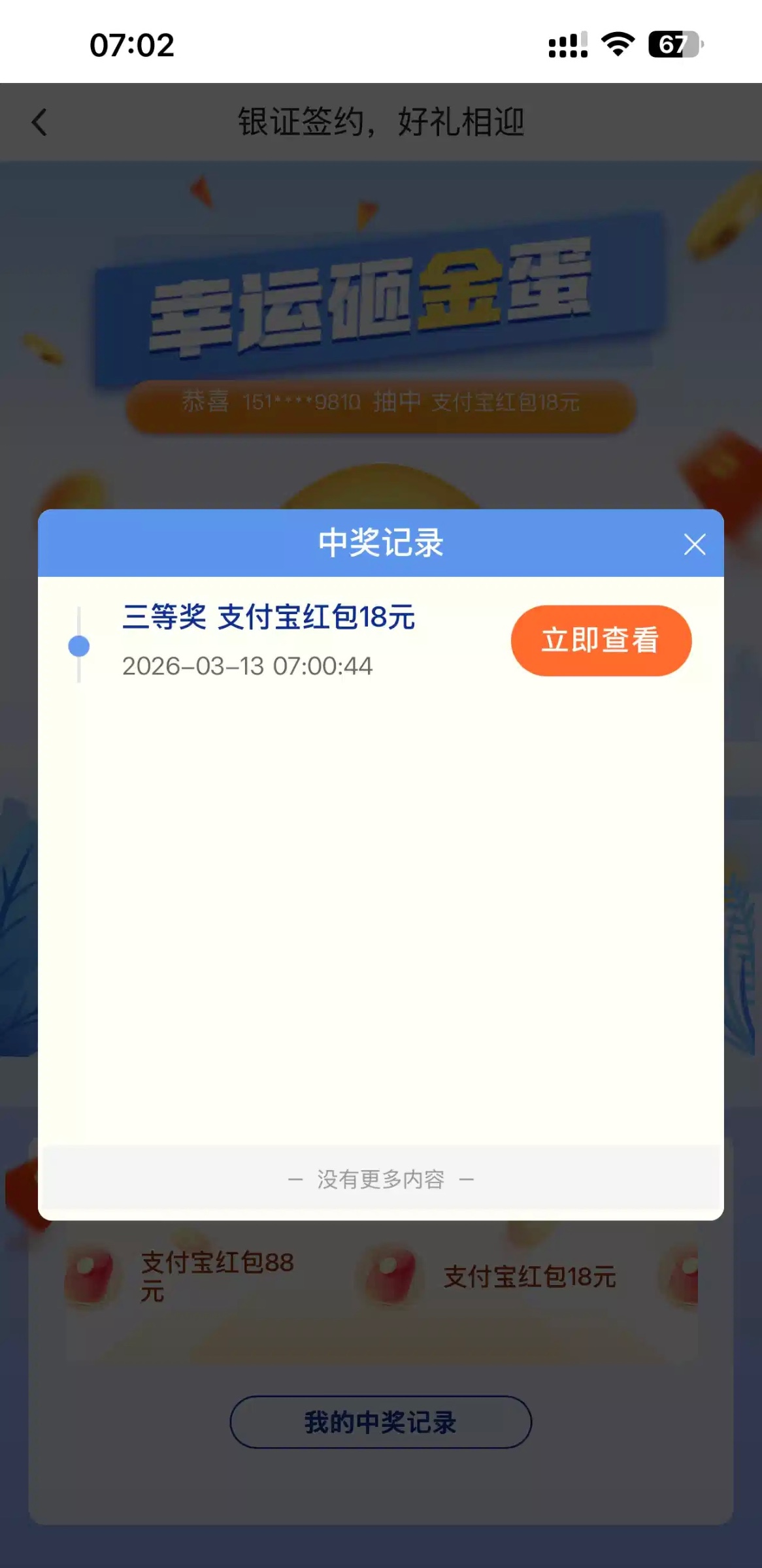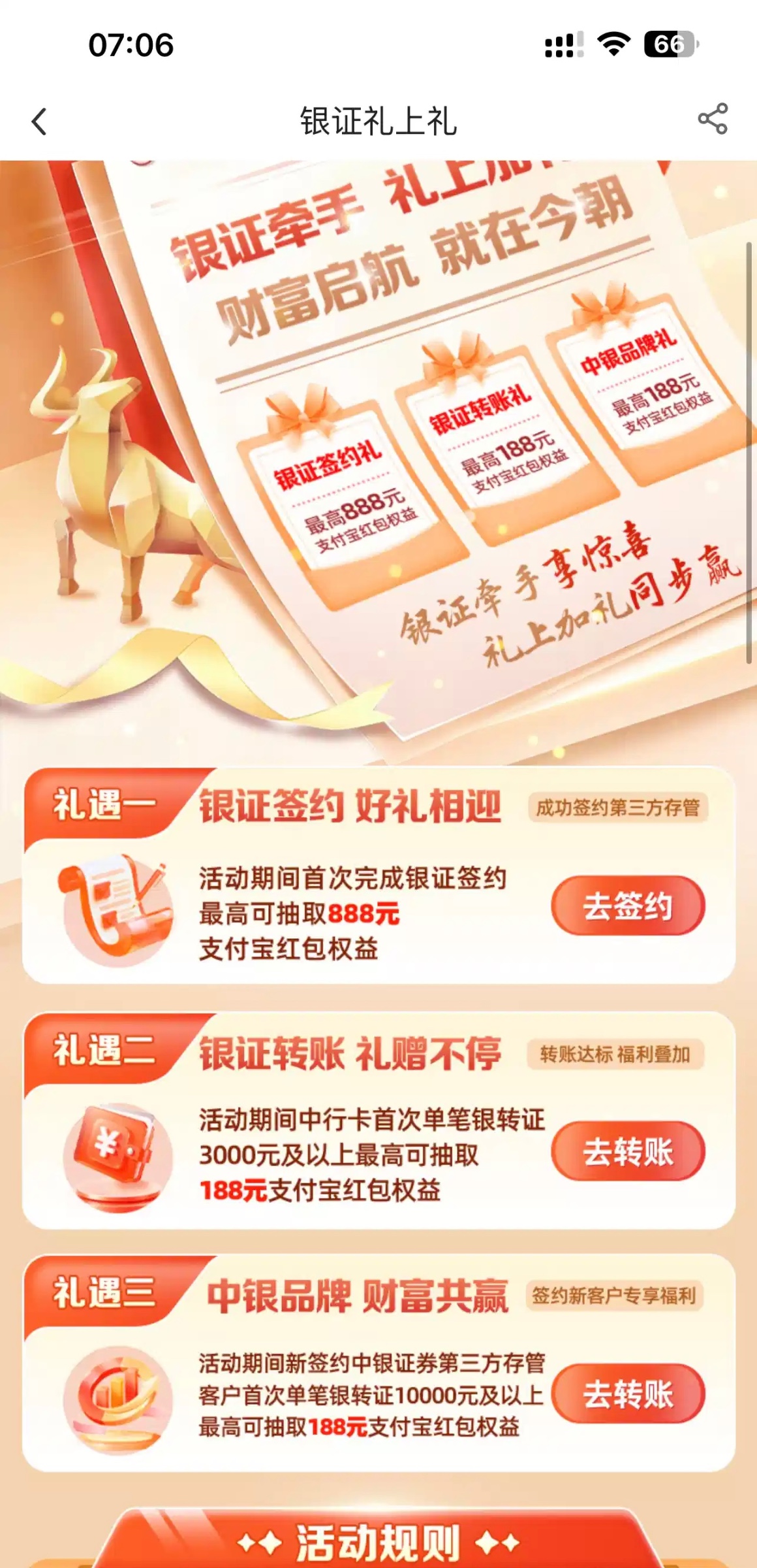 支付宝财富宠粉节,开通过中国银行证劵的,去下载中国银行app,还可以继续抽奖,最少18支付宝红包,最高888。中国银行点进去,首页就会弹出这个银证礼上礼,点进去第一个抽奖就OK。亲测抽到18红包